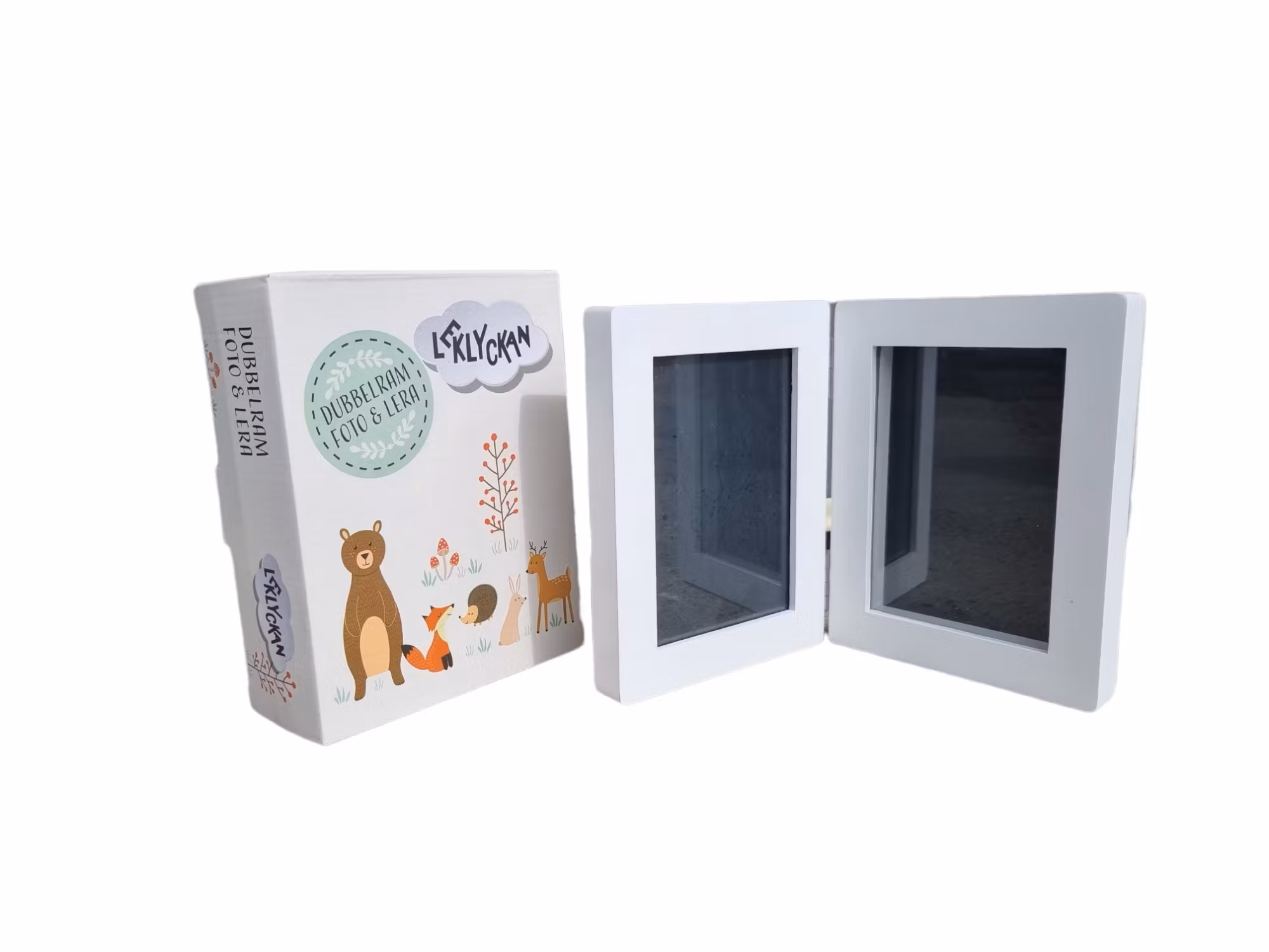 Skapa ett vackert och personligt minne från ditt barns tidiga år med Leravtryck/Foto Dubbelram från Leklyckans dopkollektion Skogsvänner. Denna stilrena dubbelram ger dig möjligheten att bevara både ett hand- eller fotavtryck och ett fotografi av din bebis i samma ram. Perfekt som en kärleksfull gåva till dop eller babyshower!