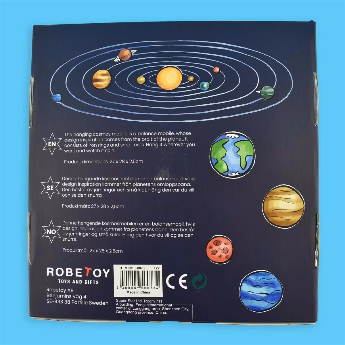 Mobile Cosmos är en perfekt kombination av estetik och funktionalitet, vilket gör den till en dekorativ höjdpunkt i ditt hem. Skapa en känsla av rymdens skönhet och låt den lugnande rörelsen föra dig in i en harmonisk värld.